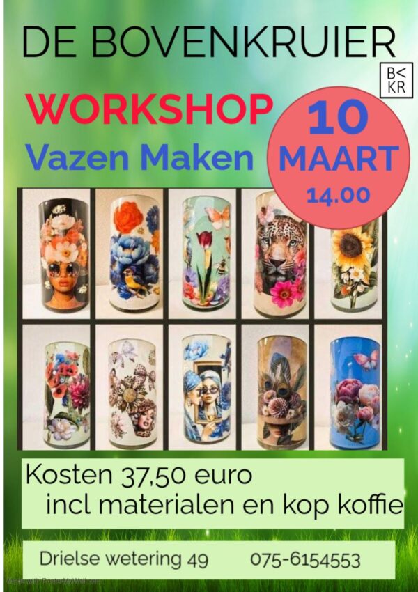 Tijdens deze workshop leer je stap voor stap hoe je een gewone vaas omtovert tot een waar kunstwerk. Je kunt kiezen uit verschillende stijlen en afbeeldingen β bloemen, dieren, portretten of iets heel eigens.